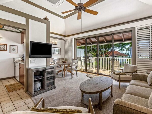 Kiahuna Planation and Beach Bungalows #2072: Settle-in under tall ceilings, stunning ocean views, and a spacious open-concept design in this vacation suite. This space features warm and cool gray tones highlighted by tropical scenes and sets the standard for peaceful resort lodging.