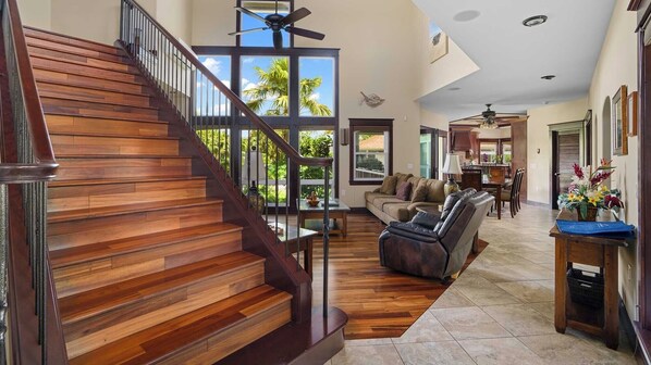 Progettato su misura con numerosi servizi, questa casa con quattro camere da letto è l'ambiente ideale per la vacanza Kauai dei tuoi sogni. Una grande vetrata incornicia le lussureggianti montagne di Kauai che ti toglie il respiro ogni volta.