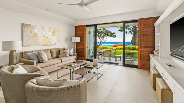 Grande TV a schermo piatto / DVD, divano letto nel soggiorno con accesso a lanai fronte mare