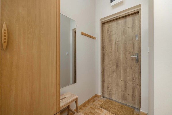 The studio on the first floor is an excellent choice for those looking for a compact, functional, and cozy space to relax. The bright interior, decorated in subdued colors with warm wood accents, promotes relaxation and creates a pleasant, homely atmosphere.
