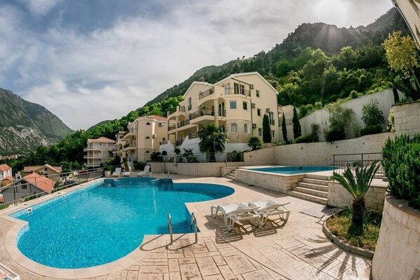 We had a nice time at this place and were very warmly welcomed by Delphina who was then also very responsible to all our requests during our stay. The apartment has two bedrooms and two bathrooms and has air con in the living room. It has a great view on Kotor old town and there are two swimming pools in the apartment complex, not very busy when we stayed in August. It was also very well equipped for our 2 years old: baby bed, high chair, toy box etc.