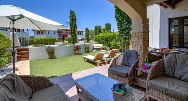 Fully refurbished interiors make Junior Villa Zeus a great choice of modern holiday accommodation on Aphrodite Hills. The interiors are light, bright and beautifully decorated. On the ground floor the living area has comfortable sofas with large Smart TV (with comprehensive TV system that has a comprehensive TV system with International sports and movie channels with playback option). The open-plan kitchen and dining room is also on the same level, and both rooms have patio doors opening up to the fantastic outside terrace that has comfortable seating, gas BBQ and astroturn lawn. All bedrooms are en suite, and the master bedroom benefits from having a jacuzzi on the balcony, also overlooking the communal pool.