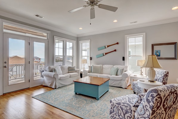 The primary suit is on the second floor and features a king bed, TV and ensuite bath with a separate shower and jacuzzi tub. A private and covered balcony off the primary suite invites romantic salt life moments with your significant other. Bedrooms 3 and 4 are also on the second floor and share a hallway full bath with a tub-shower combo. Bedroom 3 has a queen bed. Bedroom 4 is a bunk room with 4 beds and a TV. Bedroom 1 is on the first floor with a queen bed and en-suite full bath room.