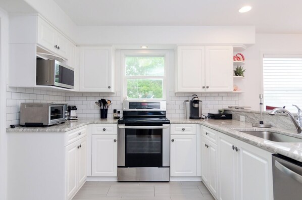The main level features an open and inviting living, dining, and kitchen area, all accented by beautiful hardwood floors and warm, welcoming touches. Whether you're preparing a big family breakfast or settling in for movie night, this space is ideal for gathering and relaxing. The fully stocked kitchen includes everything you need, even fun extras like a waffle maker and a quesadilla maker. You’ll also find a dedicated office nook and a convenient half bath on this level. Step outside to the rear covered deck to soak in the sea breeze and unwind after a day in the sun.
