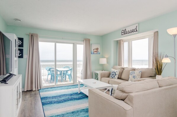 Step inside and feel instantly at ease. Dressed in vibrant teals and coastal hues, the condo’s lighthearted décor sets the tone for a relaxing, carefree getaway. The oceanfront bedroom features a cozy Queen bed, a private en suite bathroom, and direct access to the spacious deck—just imagine waking up to the rhythmic sound of waves and the scent of salt air drifting in. The second bedroom sits street side with a comfortable Double bed and a full hall bath nearby. Need extra sleeping space? The living room's sleeper sofa is ready for lounging or accommodating additional guests.
