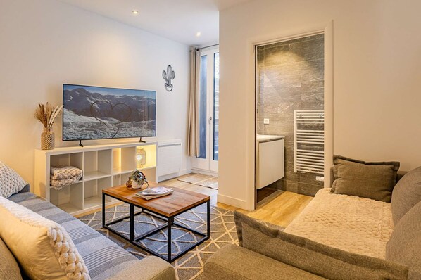 La pièce de vie principale invite à la convivialité : une salle à manger accueillante jouxte une cuisine ouverte entièrement équipée, parfaite pour préparer et partager vos repas. Un séjour séparé, aménagé avec un canapé convertible, permet d’accueillir deux couchages supplémentaires et s’ouvre sur un petit balcon, idéal pour profiter de l’air pur et des paysages alpins.