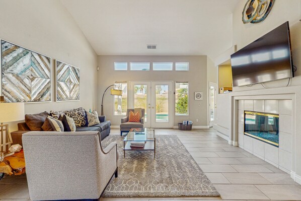 Pack up the family and make your way to this desirable, single-level home boasting an enclosed yard, private pool, and an open and bright floor plan. The remodeled full kitchen is sure to be a hit with visiting chefs, while resulting meals can be enjoyed at the casual or formal dining table, both of which are ideal for fun family game nights! The cozy living room has a gas fireplace to warm up the space and set the mood for nights around the TV or entertaining visitors. Outside, the sparkling pool and spa offer magnificent views of the surrounding mountains, and a comfortable seating area is a perfect spot to enjoy afternoon cocktails or to witness some of those amazing desert sunsets.