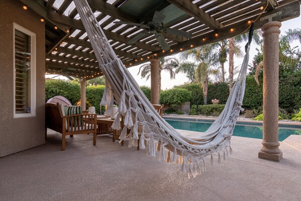 We loved the mature landscaping in the back yard with the pool and yard lights; a serene setting for a relaxing vacation. The house was super clean - and thoughtful touches made all the difference - lots of towels, beach towels for the pool, no-stick pans that actually work. Thanks for your responsiveness when we had a blip with the hot tub; fixed the issue in no time. We recommend this home for families or two couples get away together.