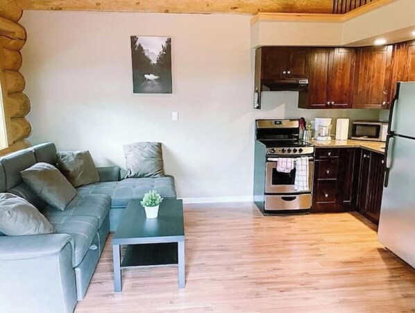 Back inside, the cabin features comfortable furnishings and rustic decor, creating a warm and inviting ambiance. The well-equipped kitchen allows you to prepare meals with ease, whether it's a simple breakfast or a delicious dinner. The dining area provides a cozy setting for enjoying your culinary creations or engaging in board games and lively conversations.