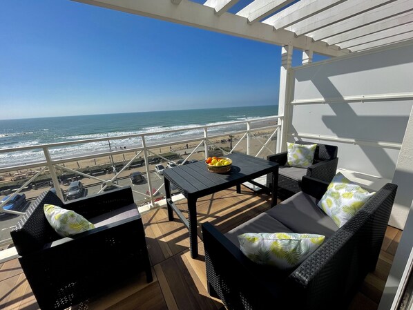 The balcony, accessible from the living room, offers a beautiful view of the ocean and is fitted out with a table and chairs, ideal for enjoying sunsets and the maritime atmosphere.