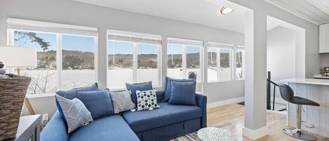 Modern Lake Opechee Home features Sandy Perched Beach and Dock