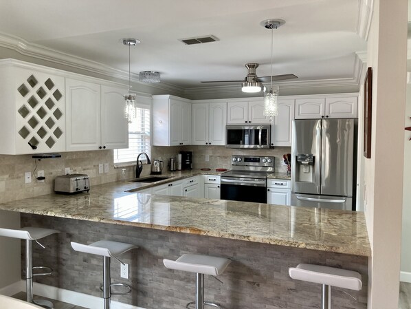 Kitchen – Features all major stainless steel appliances including fridge/freezer with ice and water dispenser, electric stove and oven, microwave, and dishwasher plus all the necessary kitchen utensils, pots, pans and cutlery etc.