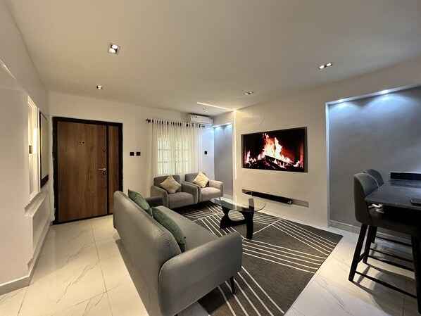 The living room is picture perfect to create your content with state of the art lighting, furniture, wall frames and general aesthetics design. The main entrance door leads to the living room. With multiple windows, the living room receives plenty of light, making it a wonderful place to relax. There is ample climate control at your disposal with natural air and air conditioning. The profile linear light gives the sitting room an exciting feel. The TV in the living room is equipped with cable/ Netflix and fire stick tv. For entertainment you have premium YouTube to watch 100s of music without ads. A guest toilet is also present in the living room for the convenience of visitors. There are designated areas in the living room for dining and ironing. The ironing area has an ironing board and an iron for whenever needed.