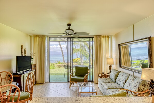 Kick back and relax at this oceanview condo where you can open your sliding glass doors and welcome in the Hawaiian sunshine and sea breezes. Inside this condo, you'll find a well-equipped, full kitchen, an intimate dining table, and a cozy living area with rattan furniture, a cooling ceiling fan, and a TV all ready for movie nights. This condo also includes a desk and chair and high-speed WiFi in case you need to do some remote work or schooling while away from home. You will also enjoy access to a shared pool just a short walk from your door.