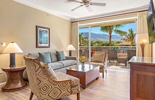 Boasting an incredible oversized lanai and spacious interior, Konea 212 is a luxurious two-bedroom mountain view suite offering a spacious primary bedroom and converted den with custom doors for privacy. Enjoy frequent afternoon rainbows over the West Maui Mountains from the lanai's lounge area or a meal with family around the outdoor dining table.