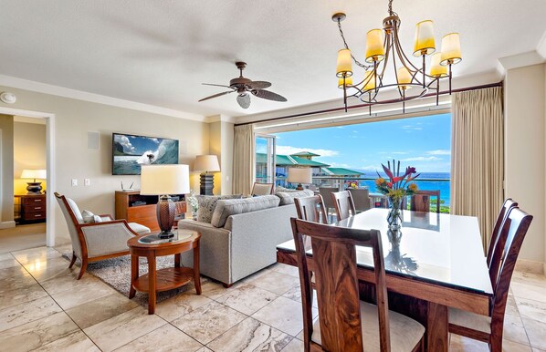The three-bedroom deluxe oceanview suite, Hokulani 729, delivers sweeping views of the blue Pacific Ocean that extend to nearly every room. Its floor-to-ceiling glass doors fold away to reveal an expansive glass-railed lanai offering unobstructed ocean views and a superior vantage point for whale watching during the winter months. Exceptional quality throughout, including travertine floors, granite countertops, and modern wood cabinetry, gives this suite its elevated feel.
