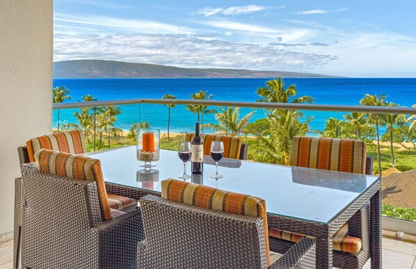 We encourage you to express your culinary creativity in the gourmet chef's kitchen. The space is fully equipped with stainless steel Viking appliances, including dual ovens and a built-in wine fridge. There is plenty of space on the ample granite countertops, and we have provided all the cookware and utensils for you to prepare the perfect meal or refreshment... just bring the ingredients. Enjoy your meals on the spacious oceanview lanai or dine indoors in the climate-controlled air conditioning.