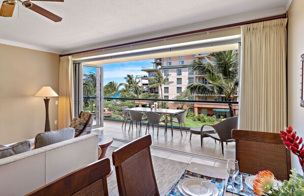 Get swept away by the lovely Maui sky after folding away the glass doors and allowing the interior to blend seamlessly with the outdoors. Enjoy your meals on the spacious lanai or dine indoors in the cool comfort of climate-controlled air conditioning.