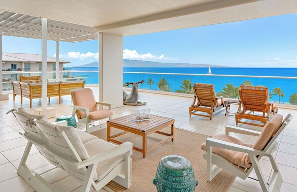Representing the pinnacle of resort accommodations on Maui, Hokulani 650 is a 3BR/3.5BA oceanfront paradise commanding over 5800 sq ft of indoor/outdoor living area and unparalleled ocean views that extend to nearly every room. Its spectacular 3200 sq ft lanai is the largest available at the entire resort, providing your group an additional outdoor dining area featuring a built-in Viking grill, multiple lounge areas, and awe-inspiring panoramic views of the ocean and Maui's neighboring islands, Lanai and Molokai.