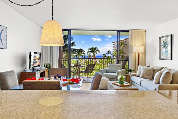 Welcome to Ka'anapali Shores 433, a stunning 1-bedroom, 1-bathroom condo located on the 4th floor that offers central A/C and stunning ocean views from your private lanai. There are elevators at this property. Unit 433 can accommodate up to 4 guests. The bedroom boasts a king-size bed and a flat-screen TV for your comfort and entertainment. The bathroom features a tub/shower combo and a well-appointed vanity, while a washer and dryer are provided for your convenience. The living room, tastefully updated, invites you to unwind with its cool blue tones and a flat-screen TV, ideal for cozy movie nights. Additionally, a Queen-size sofa sleeper is available for extra guests. Step inside to discover a beautifully light-filled interior adorned with refined Hawaiian-inspired decor and furnishings, perfectly complemented by modern touches throughout. The fully stocked kitchen offers a refreshing space for culinary adventures, and you have the option to dine al fresco on the lanai or gather around the indoor dining table for 4.