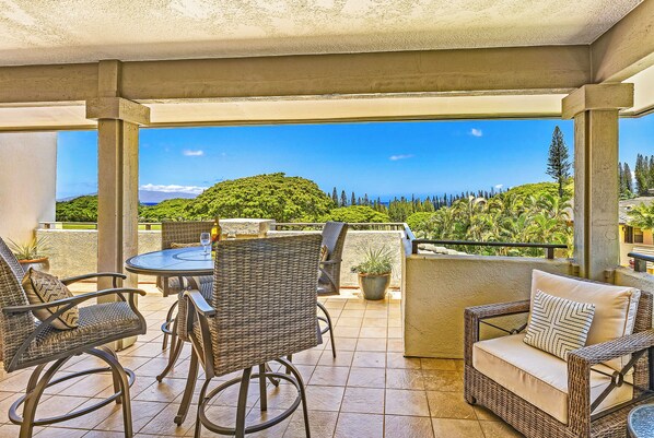 Questa confortevole villa con 1 camera da letto con circa 1000 piedi quadrati di spazio interno, escluso il grande lanai di 400 piedi quadrati, (balcone); risiede nell'edificio 16 sulla "T", (livello di parcheggio), molto comodo senza scale dal parcheggio dedicato a circa 40 piedi dalla porta d'ingresso al piano terra. Anche se non ci sono scale, questa villa è tecnicamente al secondo piano quando esci sul lanai, (balcone), di fronte alla vista mentre l'intero complesso è costruito su una collina rivolta a ovest. Questa villa angolare (senza pareti condivise su un lato) ha un ampio spazio di vita con grandi porte scorrevoli e finestre rivolte a ovest verso l'Oceano Pacifico con magnifici tramonti hawaiani che si affacciano sul campo da golf di Kapalua Bay.