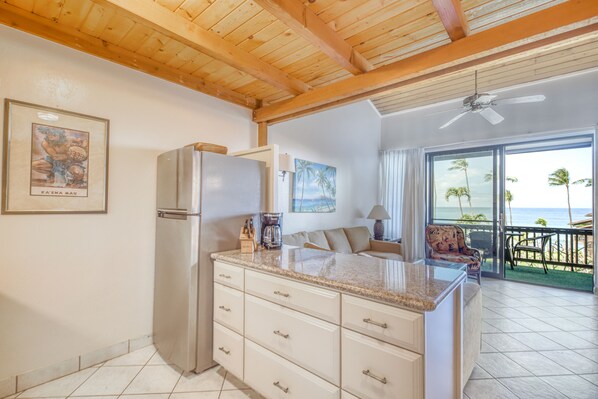 Find yourself instantly at ease inside this lofted, oceanfront getaway - the perfect home away from home for a family vacation on Maui. Prepare meals or reheat your leftovers in your well-equipped, full kitchen, and then dine indoors at the table our alfresco on your furnished balcony. After days out on the local beaches, come back home and watch your favorite shows in the cozy living area complete with a sectional sofa, cooling ceiling fan, and a cable-equipped, TV. You will also enjoy access to lush, landscaped grounds, shared gas grills, and a pool