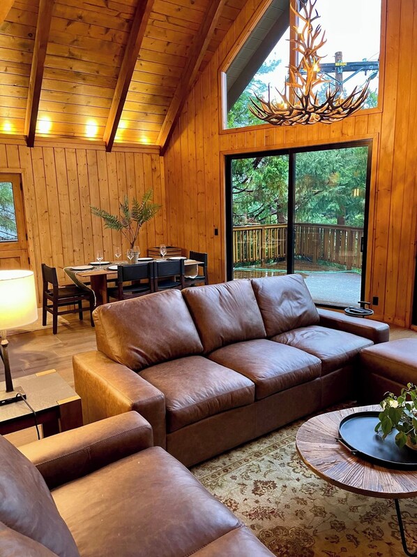 This newly remodeled cabin in Lake Arrowhead offers a balance of rustic character and everyday ease. Designed to sleep up to six guests, the home includes three bedrooms and three bathrooms arranged for privacy and comfort. Hardwood floors run throughout, paired with vaulted ceilings and exposed wooden beams that add warmth and openness. Large windows bring in natural light and frame peaceful forest views, making the living areas feel connected to the outdoors even on cooler days.