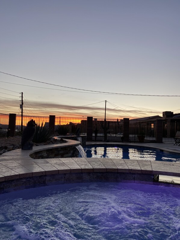 We stayed for a full month in January. The home is in a nice, convenient location and it is set up with everything you need to enjoy life away from home. We were there for the hot air balloon festival and it was great to go to the upper deck and watch balloons on the horizon. Plus, it was a relaxing place to see the lake and watch sunsets. The pool and hot tub are nice, but they are not heated. The owner said you can pay extra to have them heated in winter months. We loved all of the outdoor living space with a BBQ and Blackstone Grill. We cooked breakfast several times outdoors, including pancakes on the Blackstone Grill. The hosts were helpful and made us feel at home for our stay.