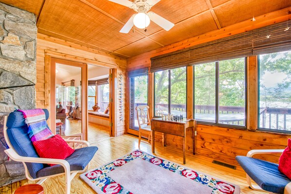 Lakeside retreat with water views, pool, wraparound deck, patio & game room
