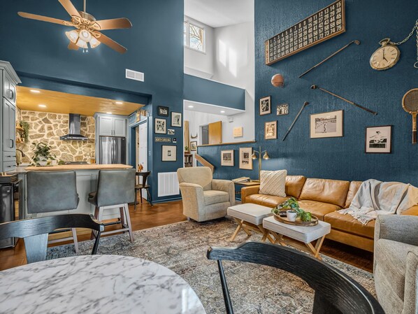 Soaring vaults of moody blue in the living and kitchen area have been designed with vintage photos and memorabilia of activities which can be done in and around the resort (golf, tennis, rowing, water- and snow-skiing) as well as a curated selection of North Carolinian Greats, many of whom fall in the sports’ category. Melt into the caramel leather couch or enjoy one of the two swivel gliding armchairs from High Country Furniture. A 75” flatscreen is adjustable and wall-mounted above the electric fireplace. Cable is provided through Dish Network and the unit includes WiFi. Munch on meals from the table in the living area overlooking the lake, visit with the cook from the counter-height swivel stools located on the movable island, or cozy up at the bistro table in the kitchen.