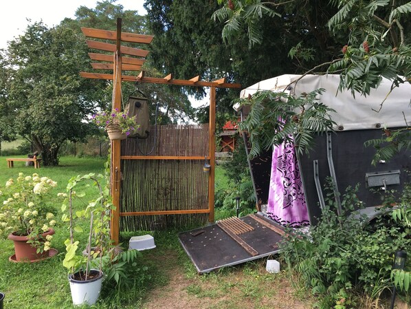 Next to the caravan, in a horse trailer, you'll find a composting toilet and a solar shower.