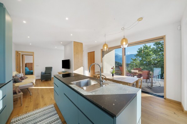 L’appartamento è esposto a sud-est e offre 55 m² per 2-3 persone. È dotato di pavimenti e mobili in rovere oliato. Le pareti interne sono tinteggiate con colori naturali a base di calce e le finestre in larice non trattato favoriscono un clima interno piacevole. L’ampia cucina-soggiorno è luminosa, arredata con gusto e dotata di piano di lavoro in basalto della zona dello Sciliar. Geotermia e impianto fotovoltaico rendono l’appartamento quasi autosufficiente dal punto di vista energetico. Il riscaldamento a pavimento garantisce temperature piacevoli tutto l’anno. La cucina è completamente attrezzata con piano cottura, forno, lavastoviglie, frigorifero con congelatore e bollitore.
