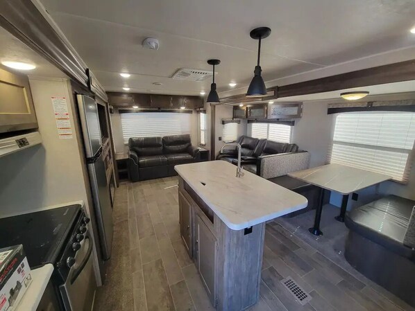 Fun 35' Puma Camp Trailer set up for stay in secluded area. We are about 40 minutes from White Sands National Park and yet close enough to Las Cruces for easy access. Queen bed with memory foam mattress in private bedroom. There is also a sofa bed and the dining table can be made into another bed.