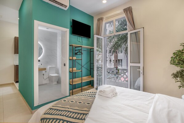 Questo appartamento monolocale comprende una terrazza panoramica in comune per le serate di relax.