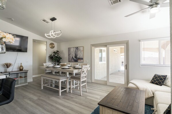 INDOOR LIVING: 2 Smart TVs, books, dining table, walk-in showers, jetted tub, shower/tub combo.