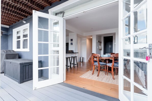Contemporary kitchen that's actually a pleasure to cook in. Plenty of bench space, quality appliances, and enough storage to unpack your groceries properly. The dining table seats 6 with extra bench seating, there's always room. French doors open straight from the dining area onto the deck, so you can flow between inside and out.