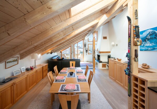 The characterful and spacious open plan living-dining-kitchen is an interesting fusion of Swiss contemporary and traditional chalet style with its wooden beams and high ceilings. Floor to ceiling panoramic windows and doors open out onto well-furnished balconies on opposite sides. After the sunset, sip a hot chocolate by the flickering light of the unique feature fireplace.