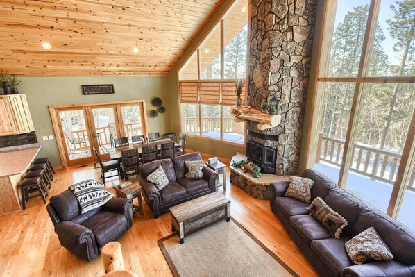overlooking the Hills, an gas fireplace, and a walk-out to the deck with a B.B.Q. Grill