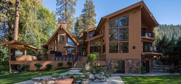 Formerly honored as the "Best Airbnb/VRBO" in the Pacific Northwest for 2018 by King 5's Evening Magazine, the Riverside Vacation Home ensures a comfortable stay with flexible sleeping options. Three private master king suites and four additional bedrooms accommodate up to 12 guests. The kitchen is well-equipped for preparing gourmet meals, and ample dining areas and meeting rooms provide space for various activities.