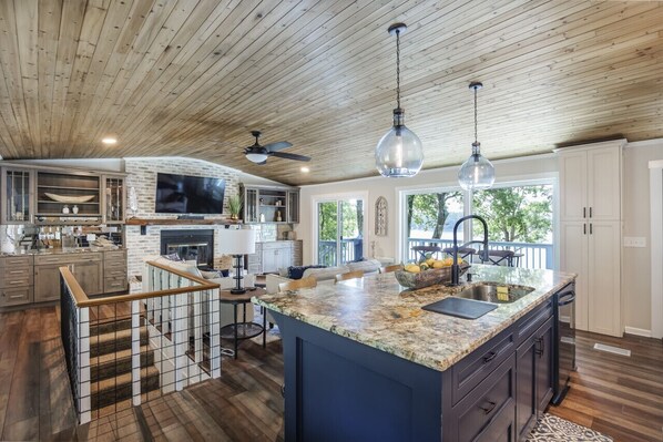 When you first walk in, you will see the large kitchen and comfortable living space. The kitchen has a large island with seating, as well as a bar overlooking the lake. It is stocked with all the essentials needed to cook/ entertain for your stay!