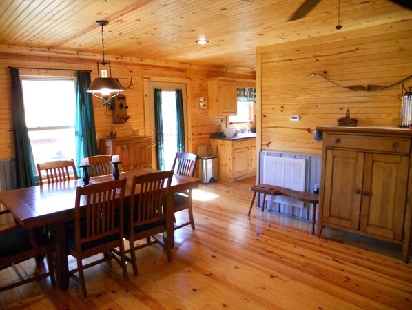 La cucina / sala da pranzo / soggiorno è un piano piano aperto. Resta tostato davanti al camino e divertiti con Wifi, Netflex o più giochi da tavolo forniti. In cucina troverai elettrodomestici in acciaio inossidabile e un fornello a gas, oltre a una dispensa ben fornita. Un barbecue si trova sulla veranda per la vostra convenienza.