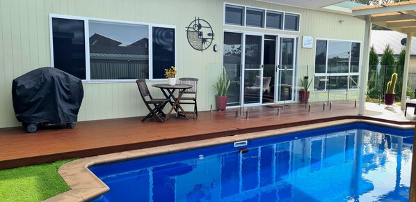 The private outdoor area overlooks the pool and garden and is for your exclusive use including the pool, garden, BBQ, lounge, table & chairs.