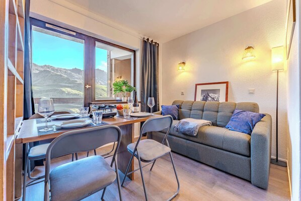 - Perfectly located in the Olympiades building, this ski-in/ski-out apartment offers breathtaking mountain views, direct access to the slopes, shops, and restaurants.