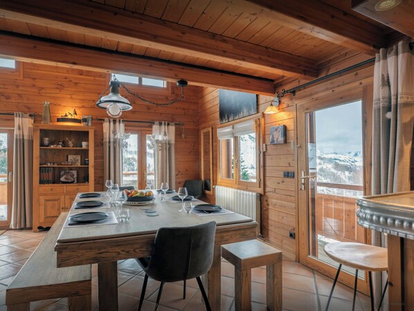 The living room is one of the chalet's great assets. There’s a comfortable seating area with a TV and wood-burning stove, and the well-equipped kitchen has everything you need to cater for a large group. The superb terrace that wraps around three sides of the chalet, allows you to relax and admire the view, perhaps from the hot tub.
