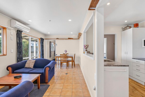 The cottage has 3 comfortable bedrooms and all the basics for a relaxed, low-key stay. The kitchen is set up for simple meals, with a benchtop oven, a good fridge/freezer, and a BBQ for easy outdoor cooking. It’s well suited to families, with the beach just a short walk away – a safe, shallow inlet, plenty of space to explore at low tide, and swings under the pōhutukawa trees for the kids. Spend your days at the beach, head out to nearby Tata or Wainui, or enjoy a quiet evening on the deck. It’s simple holiday living – the way it used to be.