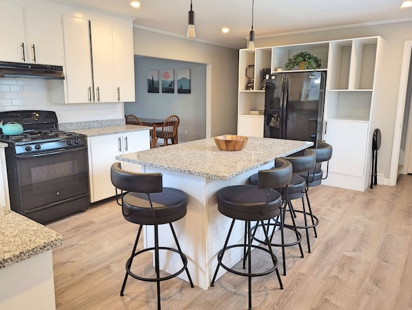 Enter this 4-bedroom house through the foyer next to the garage, and step through to the the back yard or bear left into a brand new kitchen. This home has been renovated extensively, so light and bright is the name of the game. A large kitchen island holds seating for 7, while the dining area is off the kitchen to the left seats the same. (Ice maker not hooked up per H.O.) Beyond the dining area is the living room, with an electric fireplace, flat-screen TV, and AC, with the front door in between.