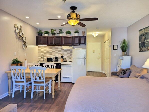 Enter this bright studio with full bath at the Lodge at Lincoln Station to the foyer area, with full bath to your right and large closet on your left. A few steps beyond, a well-appointed small kitchen is along the right wall, flanked by the dining area with seating for four. Beyond this is the large flat-screen TV with window to the deck. Open the slider and step out to that spacious sitting area and enjoy mountain views in winter and lovely shade in summer. Coming back in, on the opposite of the studio find a king bed flanked by 2 twin sleep sofas, making for a comfortable living area.