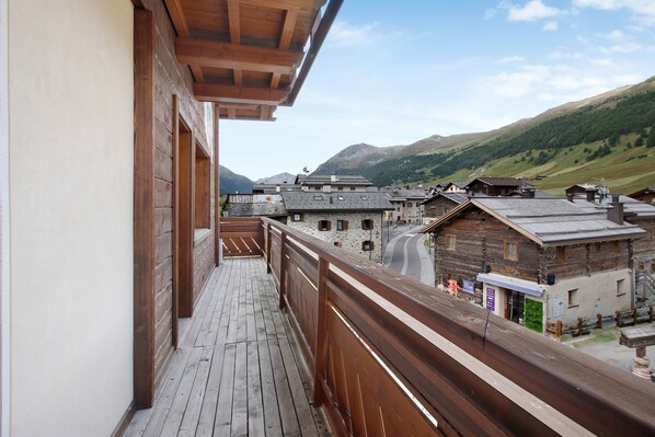 Dal grande balcone, accessibile dalla cucina/soggiorno e da una camera, si gode di una vista impareggiabile sulle montagne. Questo spazio è perfetto per un caffè al mattino o un bicchiere di vino la sera, in un ambiente alpino mozzafiato.