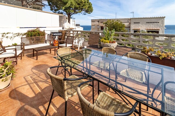 Outside: large terrace with outdoor furniture.