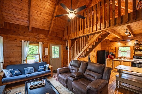 Welcome to Buckeye Loft: This budget-conscious and pet-friendly space can sleep 4 adults/children and is located on a trail to the Hocking River; just a short drive to all Hocking Hills parks and activities. It's located on the same lane/land with another 4 person cabin (Liberty Belle) and a 12 person lodge (Trails End Lodge). Often these three spaces are booked all together for family reunions (hosting up to 20 guests).